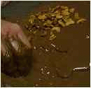 She puts both her hands into the tank of molten chocolate (110-120 degrees) cups them, pulls out a healthy portion and plops it on the marble table. She then massages it, letting it cool slowly, to avoid "shocking" where the butterfat will bloom, and white streaks will appear in the finished product. When it cools to about 92 degrees, she takes a handful of peanuts and begins dipping.
