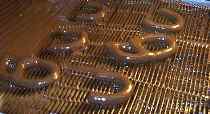 Funneled chocolates are "kisses" and nonpareils, which are dollops of chocolate dropped on a sheet of sugary sprinkles ("Jimmies"). At left, Richard, Jr. makes up a batch of nonpareils.