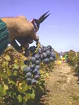 This is simple, relaxing work, shearing grapes off the vines and dropping them into bins. The vines are tall and are supported with stakes and wires, so there is little bending involved, but you are certainly on your feet all day. It is more enjoyable when I am on a good, strong vine with hearty grapes that yield a large bunch with each clipping - they feel nicer in the hand and they fill the bin faster. Some growers pay their pickers by the bin - sometimes about a dollar - and one picker loaded 137 bins in a day, Rippelmeyer says. He pays by the hour, because he says the quality is better that way.