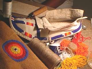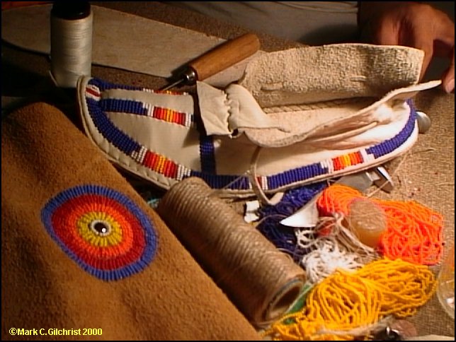 Kind Woman's mother, Cynthia Osage, (her Native name does not translate well, says Marilyn) learned the craft from her aunt, who was a Cheyenne Princess, and her mother, Maude White Skunk. Cynthia has made red beaded moccasins for Whoopi Goldberg, and pure white ones for Lionel Hampton, who gave them to his housekeeper, she says.