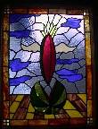 Having studied and taught art for so many years, and having such an inquisitive personality, Shaman can't help but explore many media. Among the sculptures throughout his Cleveland home are some of his paintings and even a stained glass window. (Shown to the right; "Ascending Watermelon." Though much of Shaman's work involves and relates to the common man, his artworks are certainly out of the average person's reach. Spending many weeks, and sometimes months, making a single piece, Shaman barges through barriers between punster and craftsman and fine artist, and though he sometimes begins with a simple pun ("Salvador with his Dolly") he creates beautiful, elegant works of art that command dear prices on the fine art market. Shaman's choice of media is practical, as well as aesthetic. During college, he apprenticed with a stone sculptor. When he moved to Mississippi, he could find no stone to sculpt, so he carved pieces out of logs. These were heavy and grainy and they cracked over time. Shaman developed a method of laminating wood, which gave him a lightweight, durable medium that was easier to carve than stone.