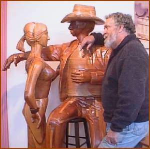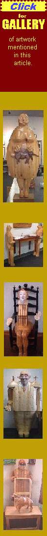 With his curious knack of poking fun at all ranks of society, no character escapes the Shaman wit. From religious leaders to barflies, from grandmothers to historical and literary figures and even wild animals, everybody and every body gets their quirks and faults cast in wood. "Right now, I'm interested in history," he says. "But a lot of the time the common man is important to me. I find that is where the true character lies." In conversation, Shaman scorns politicians and bureaucrats with the delicacy of a table saw, and it's apparent that he is comfortable in his position as artist, where he can say whatever he wishes, about whomever he wishes, whenever he wishes. Even Floyd Shaman is not immune from his own criticism; "I don't really know if my art is any good," he says. "That'll all have to be sorted out in a hundred years." Discussing the legendary Mississippi folk artists, Shaman gives me a short lesson in the origins of true artwork. "I'm a University trained artist," he says. "I could do folk art, but it would be a fraud."
