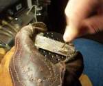Hunched over the vise, Howard focuses intently on his subject. With a heavy, leather glove protecting his left hand, he uses a small chisel in his right. He carves out the edges of leaves, using a "wriggle" stroke, so named because he gently rotates his hand - and the chisel - along the metal. This creates an outline of paisley designs. He then uses a pneumatic graver to carve leaves inside, in a process called "western bright cutting." He uses a narrower graver, called a "liner" to give the artwork shading. He will cover the entire buckle with either engravings, logos, braids or stones (usually turquoise.) Howard finishes the buckle by polishing it on a high-speed wheel.